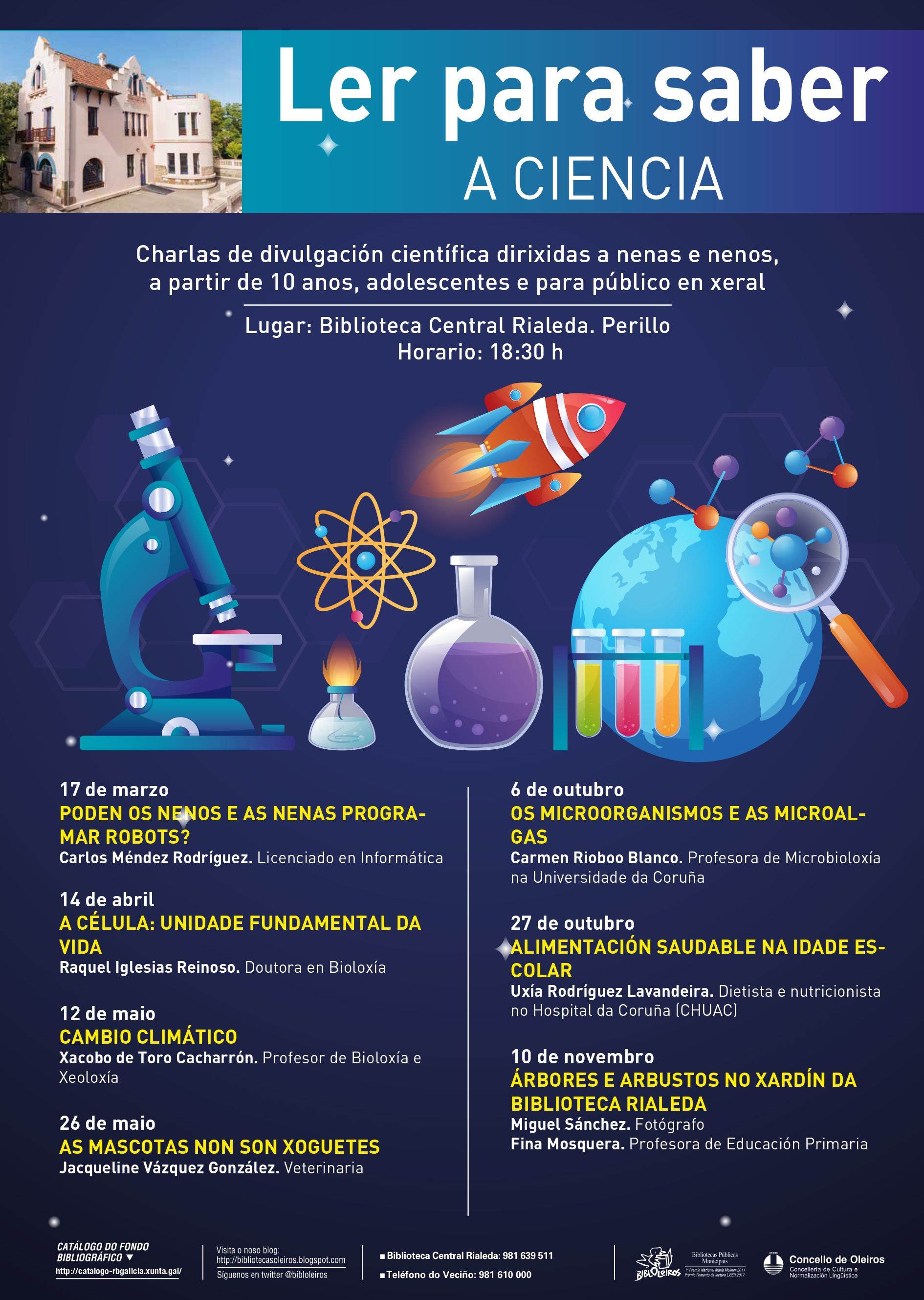 Con estas actividades preténdese achegar a ciencia a todas as persoas, ampliar os coñecementos sobre temas científicos de importancia na vida diaria, fomentar o coñecemento específico dunha materia determinada, dinamizar os fondos bibliográficos sobre estes temas, atraer á biblioteca a un público interesado pola ciencia e, en definitiva, fomentar a lectura e a consulta de libros que traten estas temáticas. Programáronse charlas e obradoiros sobre aspectos diferentes para atraer a un público de gustos diversos e variados.
