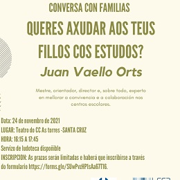 Oleiros, 22 de novembro de 2020-. O programa autonómico Espazo Educa_CreandoPontes, co que colabora o Concello de Oleiros, iníciase o próximo mércores 24 de novembro cunha charla impartida polo prestixioso docente e pedagogo, experto na mellora da convivencia escolar, Juan Vaello Orts. Esta actividade, dirixida principalmente ás familias do alumnado escolarizado en educación infantil e primaria, levarase a cabo no teatro do Centro Cultural As Torres, en Santa Cruz, a partir das 16:15 horas.