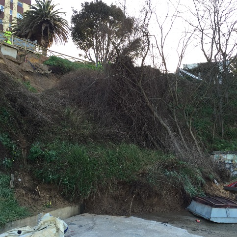 Oleiros, 01 de abril de 2016-. Cando se cumpren poucas semanas da finalización das obras de construción do muro de contención no porto de Santa Cruz, acaba de producirse un desprendemento entre o posto de socorrismo e a antiga caseta dos pescadores. Esa zona, na que tamén era preciso realizar tarefas de contención, non foi tratada por Portos de Galicia malia as demandas e indicacións realizadas desde o Concello de Oleiros.