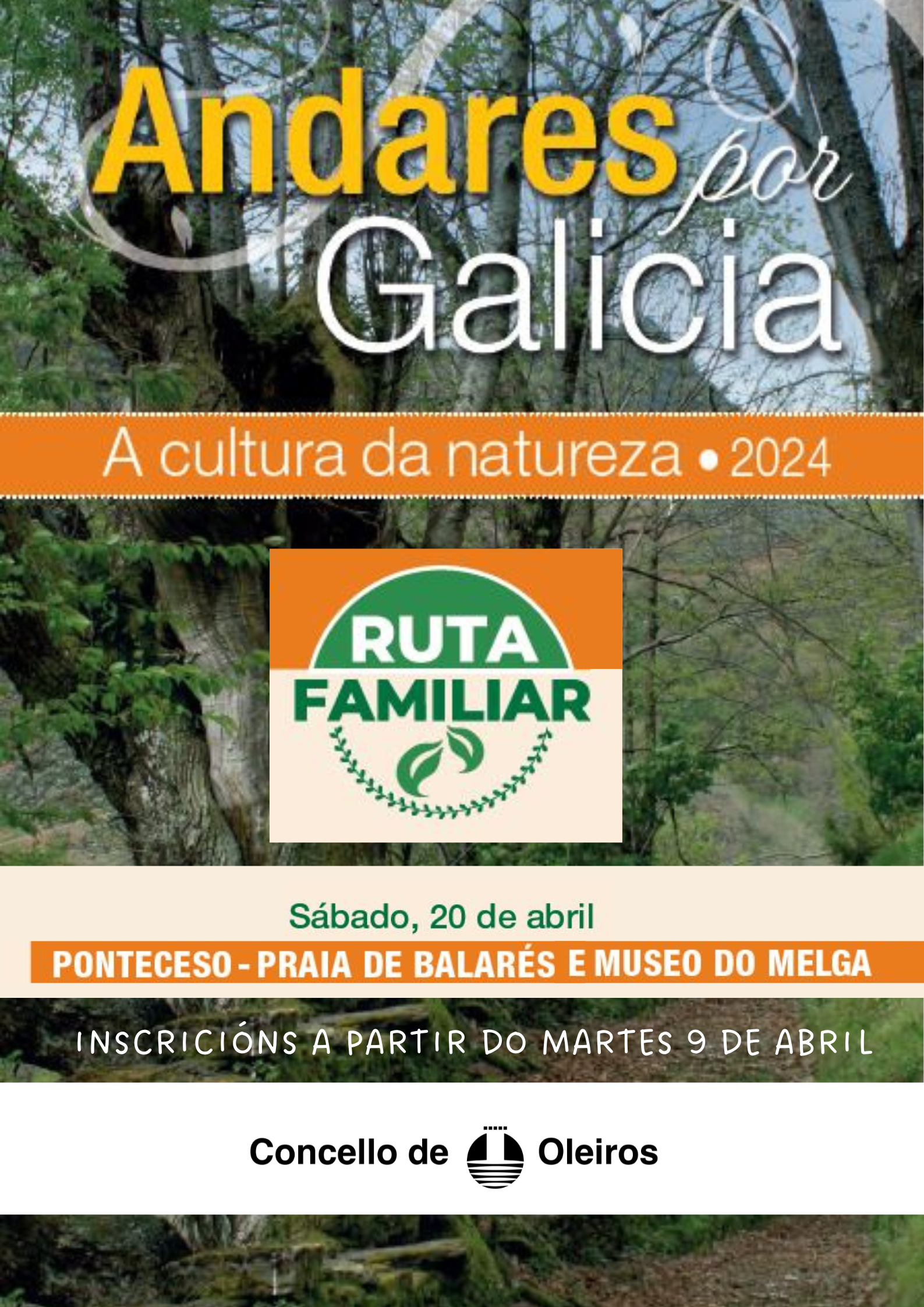 O vindeiro sábado 20 de abril terá lugar unha nova edición do programa Andares por Galicia, a Cultura da Natureza, organizado polo Concello de Oleiros, coa ruta de PONTECESO-PRAIA DE BALARÉS E MUSEO DO MELGA