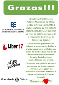 O Sistema de Bibliotecas Públicas Municipais do Concello de Oleiros recibirá o Premio Liber 2017 ao fomento da lectura en bibliotecas abertas ao público que concede a Federación de Gremios de Editores de España. Este acto terá lugar en Madrid, o día 5 de outubro, no marco da Feria Internacional del Libro.