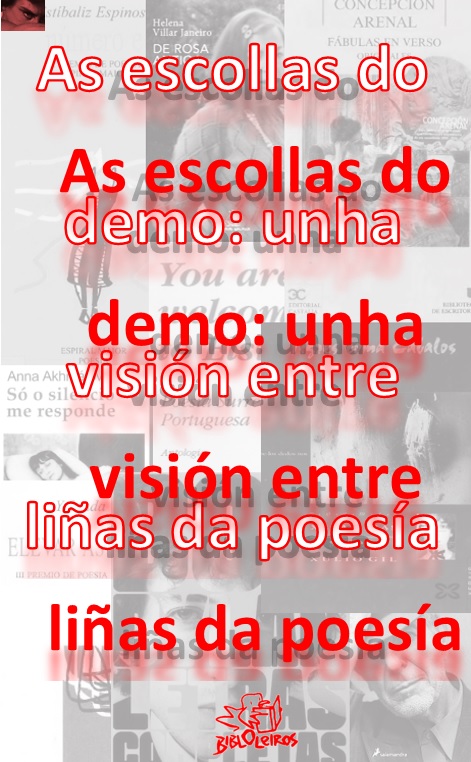 De ningunha maneira debería considerarse a quen realizou a escolma desta exposición como unha voz autorizada para determinar que autoras-es son as-os mellores de entre as-os que residen nos andeis desta biblioteca. Por tanto, quen asumiu esa comprometida tarefa, consciente da súa limitación, decidiu esquecer ese criterio de procura e centrarse nas peculiaridades de cada volume. Seguro que faltan moitas voces da poesía galega; terá razón quen iso observe. Tamén moitas voces da poesía española, e moitas máis serán as ausencias no que se refire á poesía dos países lusófonos. Pero hai outros criterios para montar unha exposición. Ás veces o reseñable non é a autora ou autor da obra, nin a obra en si, senón as circunstancias nas que é publicada, quen dirixe a edición, ou ben outras circunstancias que envolven ao volume, como por exemplo como chegou a estar aquí.