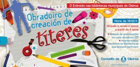 Este Entroido, as nenas e nenos que o desexen, poden participar nos Obradoiros de creación de títeres que se celebrán nas oito bibliotecas municipais. Elaborarán sinxelos monicreques confeccionados con variñas, pelotas de porexpan, goameva, feltro, etc.