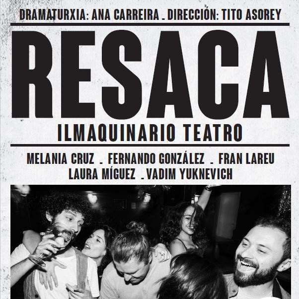 Oleiros, 07 de marzo de 2017-. A compañía Ilmaquinario Teatro presenta o sábado ás 20:30 horas no Auditorio Gabriel García Márquez de Mera o seu espectáculo Resaca, escrito por Ana Carreira e dirixido por Tito Asorey. Melania Cruz, Fernando González, Fran Lareu, Laura Míguez e Vadim Yukhnevich forman o elenco desta obra de teatro contemporáneo.