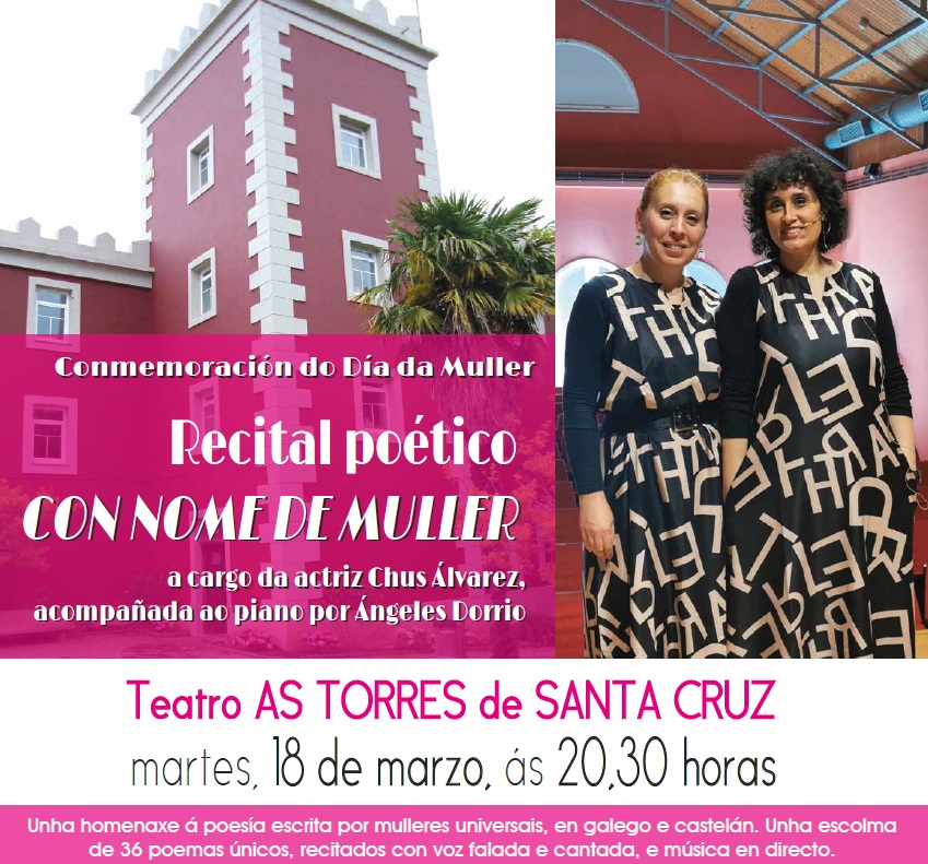Recital poético "Con nome de muller" a cargo da actriz Chus Álvarez, acompañada ao piano por Ángeles Dorrio, no Teatro As Torres de Santa Cruz, o martes, 18 de marzo, ás 20:30 h.