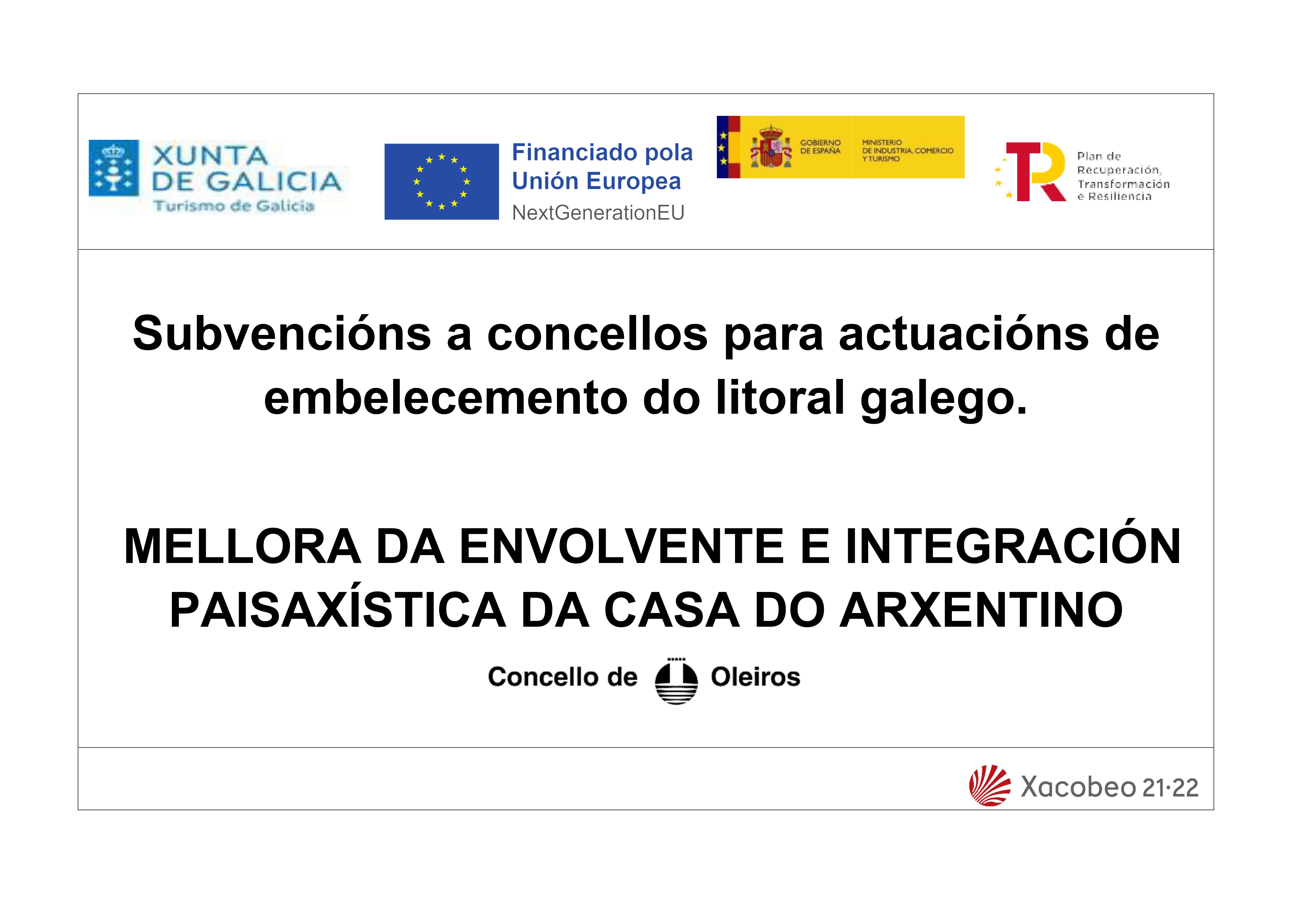 - Subvencións a concellos para actuacións de embelecemento do litoral galego, no marco do Plan de recuperación, transformación e resiliencia, financiado pola Unión Europea-NextGenerationEU,  Liña 1: Transición verde e ecolóxica para a rehabilitación do patrimonio en espazos singulares do litoral, é o Expediente: TU503G 2023 1-27