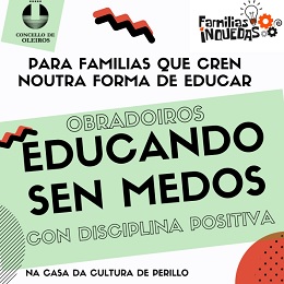Oleiros, 27 de setembro de 2019-. O luns 30 de setembro abre o prazo de inscrición para dous obradoiros dirixidos ás familias de Oleiros con menores entre 0 e 12 anos de idade organizados pola concellería de Servizos Sociais e Igualdade, dentro do programa Familias Inquedas. O obxectivo desta actividade é que os nenos e nenas medren sen medos, nun entorno seguro, de confianza e de aprendizaxe continuo, desterrando os tradicionais métodos de condicionamento tradicionais (castigos e premios).