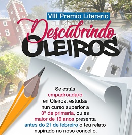 Oleiros, 17 de febreiro de 2022-. O vindeiro luns, 21 de febreiro, Día da Lingua Materna, remata o prazo para participar no VIII Premio Literario Descubrindo Oleiros. Unha proposta que busca promover o uso da lingua, fomentar a creatividade e dar a coñecer os recunchos do noso concello. O certame está dirixido a persoas empadroadas no Concello de Oleiros ou escolarizadas no municipio desde 3º de primaria. Os relatos poden entregarse na conserxería da Fábrica.