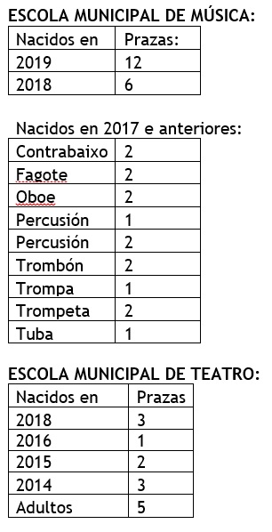 Tras o prazo regulamentario de matriculación nas escolas municipais de música e teatro fican as seguintes prazas vacantes para todas aquelas persoas que queiran iniciar a súa formación musical ou teatral: