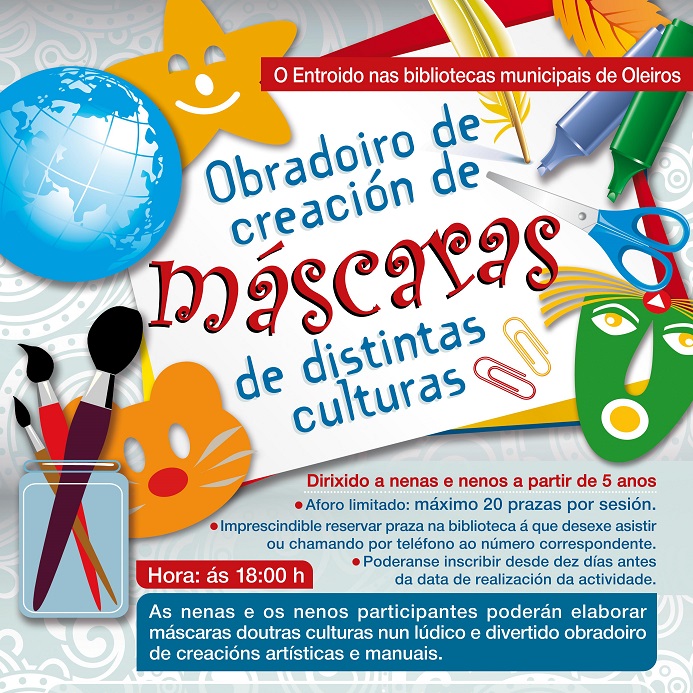 Oleiros, 25 de xaneiro de 2016-. O Concello de Oleiros organiza para este Entroido uns obradoiros de creación de máscaras doutras culturas que terán lugar en todas as bibliotecas municipais. As nenas e os nenos participantes elaborarán máscaras nun lúdico e divertido obradoiro de creacións artísticas e manuais.