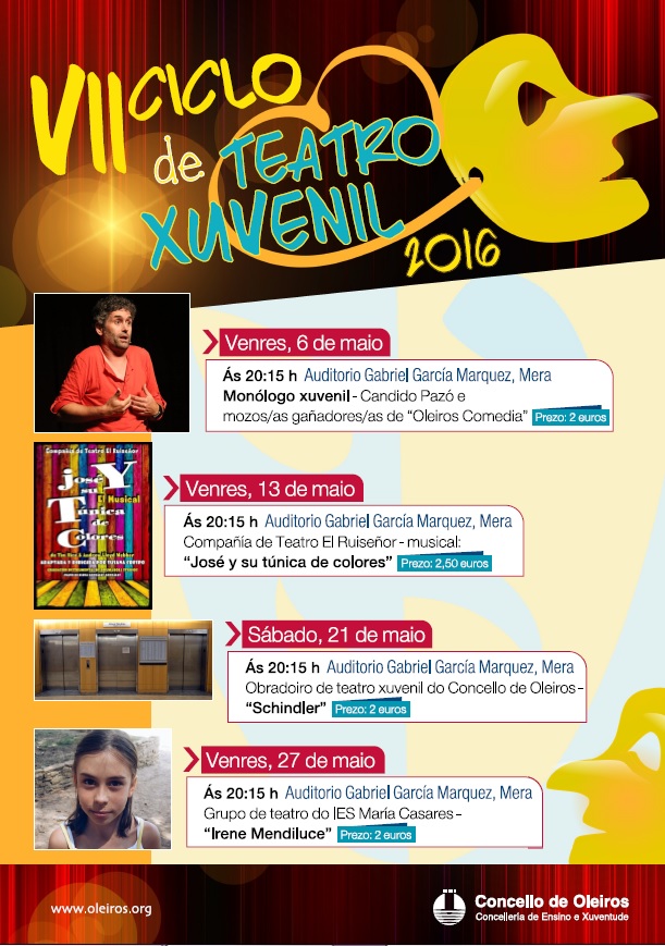O Concello de Oleiros organiza desde a Concellería de Ensino e Xuventude o VII Ciclo de Teatro Xuvenil: Os días 6,13, 21 e 27 de maio poderase gozar no Auditorio Gabriel García Márquez de grandes actuacións de mozos e mozas apaixoados polo mundo da interpretación.