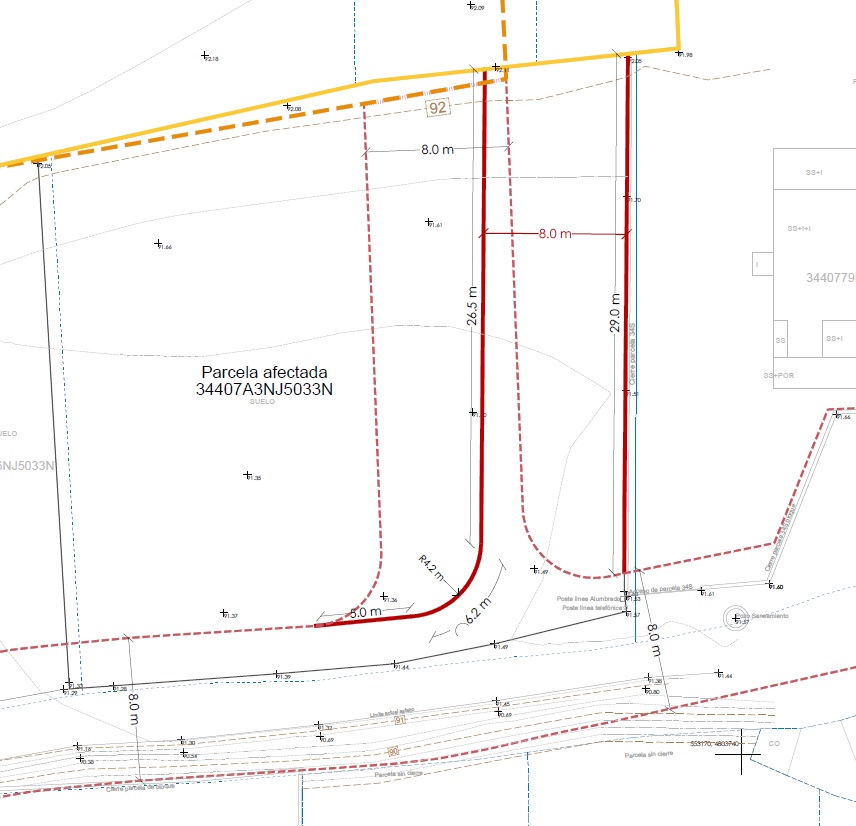 O axuste consiste no traslado íntegro da vía cara ao leste un máximo de 5m, segundo indícase en planos, chegando co límite do vial ao muro existente da parcela catastral 3440779NJ5034S. Este