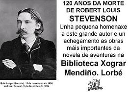 O 3 de decembro de 1894 morre o xenial escritor de novela de aventuras, Robert Louis Stevenson nacido en Edimburgo o 13 de novembro de 1850. Este ano cúmprense 120 anos da súa morte. Desde a Biblioteca Municipal Xograr Mendiño de Lorbé, queremos aproveitar esta efeméride para difundir a súa obra e a novela de aventuras.