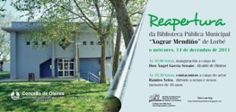 Comprácenos invitarvos á reapertura da Biblioteca Pública Municipal "Xograr Mendiño" de Lorbé, que terá lugar ás 18 horas a cargo do alcalde Don Ángel García Seoane