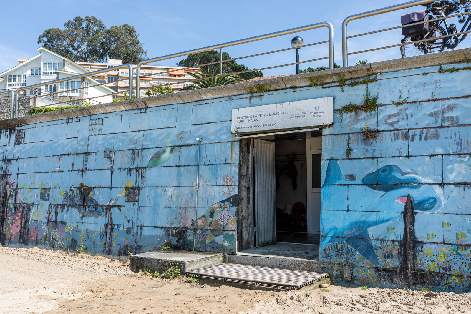 Dispón de vestiarios con duchas e almacens para os traxes, táboas, kaiaks... Os veciños de Oleiros poden utilizar este servizo co seu correspondente sistema de abono.