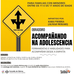 Ao largo do mes de abril vanse iniciar 3 novos obradoiros dentro do Programa de Familias Inquedas. O primeiro deles será o de “Acompañando na adolescencia” a proposta que se fai desde a Concellería de Servizos Sociais e Igualdade para as familias con fillos e fillas entre 11 e 17 anos de idade, empadroadas no Concello de Oleiros.