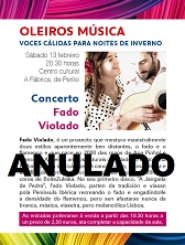 Debido a un importante motivo de saúde da cantante do grupo Fado Violado, o departamento de cultura vese na obriga de anular o concerto previsto para este sábado día 13 de febreiro ás 20.30 horas no auditorio do Centro cultural A Fábrica.