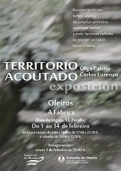 O xoves 1 de febreiro ás 20.00 horas inaugurase na Fábrica a exposición "Territorio acoutado", un proxecto que xunta poesía e fotografía. As lembranzas da poeta Olga Patiño de cando pasaba de nena os veráns na localidade de Carral (A Coruña) son o xermolo dun traballo conxunto de escritora e fotógrafo que deu como resultado un libro, unha exposición e un libro de artista. A exposición, que se presentou en novembro de 2017 en Carral, é itinerante, percorrendo diferentes localidades de Galicia (Betanzos, Oleiros, Arteixo, Sada, Culleredo, Abegondo, Cambre, Bergondo…).