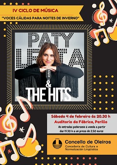 O departamento de Cultura da comenzo este mes de febreiro ao IV Ciclo de Música “Voces cálidas para noites de inverno” co concerto de Paty Lesta & The Hyts, que terá lugar este sábado 4 de febreiro ás 20.30 horas no Auditorio da Fábrica, en Perillo.
