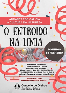 O Departamento de Cultura arranca este ano o Programa de Andares por Galicia, a cultura da Natureza cunha excursión ao Entroido na Limia o domingo 19 de febreiro, coincidindo co Domingo Corredoiro en Xinzo de Limia, onde aproveitaremos para facer unha visita guiada ao Museo do Entroido e viviremos en directo a presentación das Pantallas polas rúas deste municipio. O xantar será libre e, xa pola tarde, contamos cunha visita guiada ao Museo Etnográfico de Vilar de Santos.