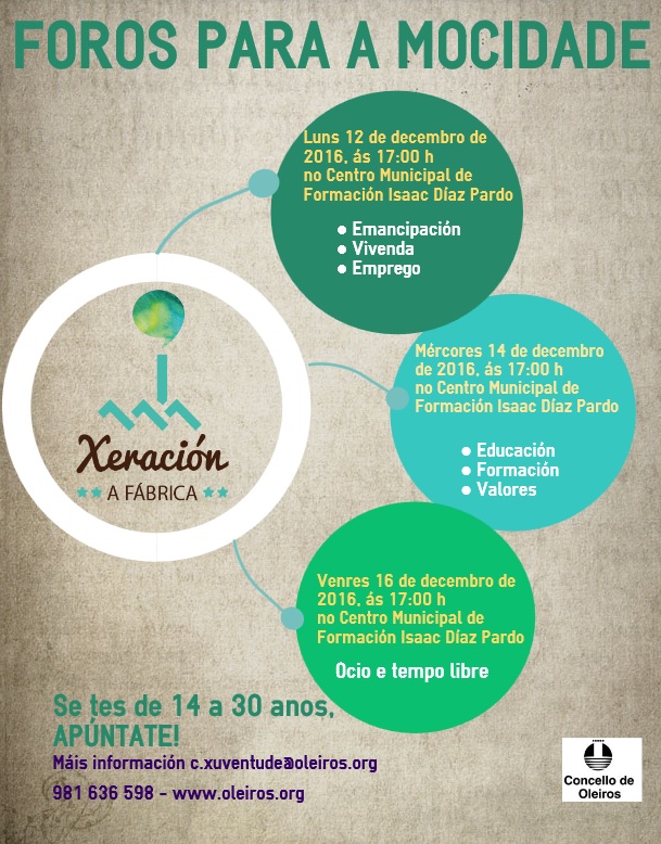 Xeración A Fábrica continúa traballando, é por iso que o Concello de Oleiros organiza os días 12, 14 e 16 de decembro uns foros temáticos para os mozos e mozas de 14 a 30 anos. Nestes espazos participarán directamente co persoal municipal e poderán intercambiar ideas e opinións sobre as diferentes temáticas programadas.