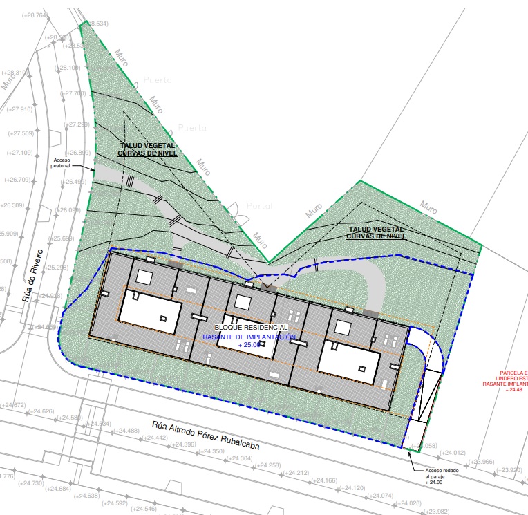 El Estudo de Detalle tiene por objeto la ordenación de la denominada Parcela F, resultante de la agrupación de las parcelas F-VPO (ref. catastral 1480612NH5918S0000ZF, 1.401 m²) y F-Libre (ref. catastral 1480611NH5918S0000SF, 1.157 m²), con una superficie total de 2.558 m² según el Catastro y de 2.557,15 m² según el “Informe de Cotas Rasante Viais, abril 2024”.