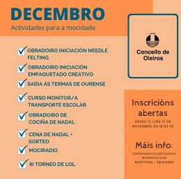 Este mes organizaranse obradoiros iniciación a needle felting, empaquetado creativo, unha excursión ás termas de Ourense, curso de monitor de transporte escolar, obradoiro de cociña de nadal, cena de nadal, torneo de LOL... ademais de continuar co programa radiofónico Mociradio. Para obter máis información ou inscribirse é posible nas casas da mocidade (Santa Cruz e As Pedras), chamar ao 981 614 083, ou enviar un correo a pix.portaberta@gmail.com ou pix.aspedras@gmail.com.