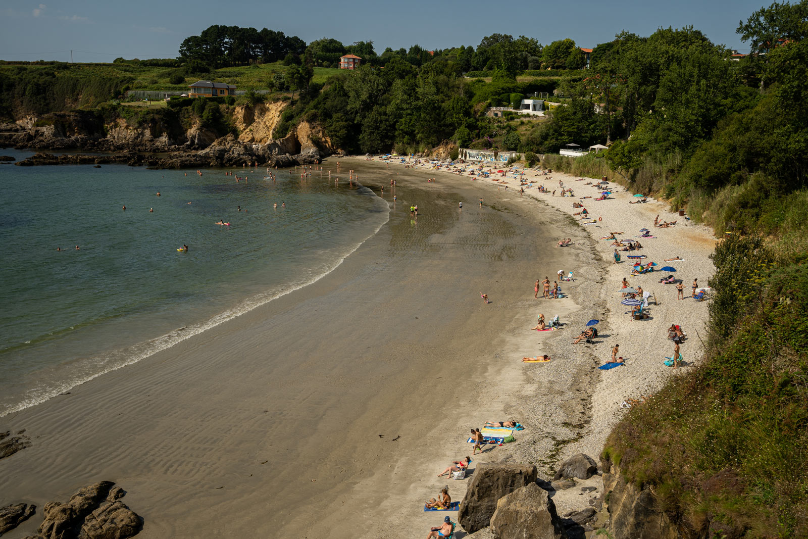 Esta praia de forma semicircular de cantos e area, ofrece augas tranquilas e moi cálidas ideais para o baño.