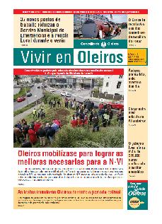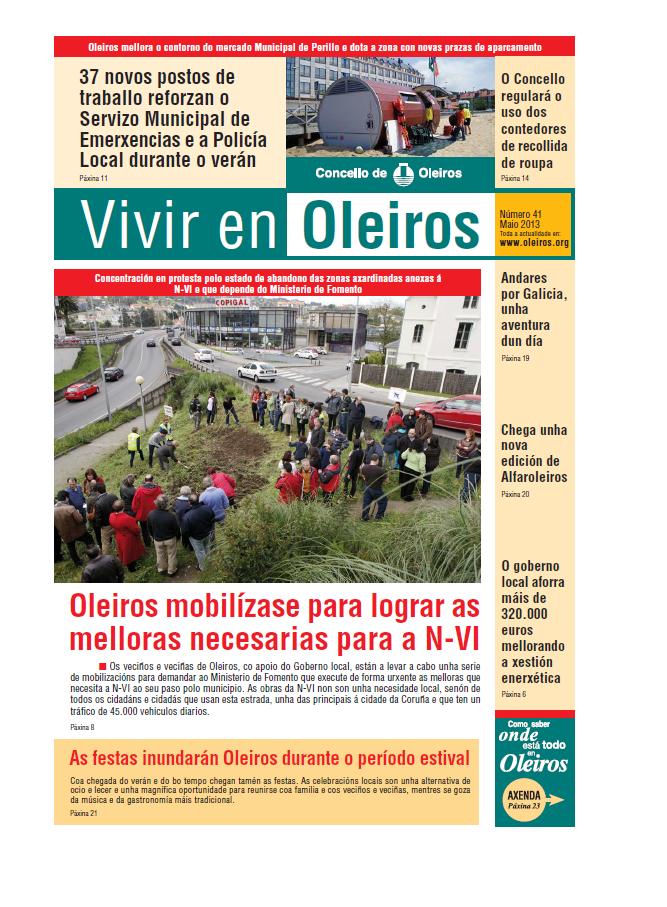 Los principias titulares son: Andarespor Galicia, unhaaventura dun día; Chega unha nova edición de Alfaroleiros; O goberno local aforra máis de 320.000 euros mellorando a xestión energética:Oleiros mobilízase para lograr as melloras necesarias para a N-VI As festas inundarán Oleiros durante o período estival Documentos VIVIR 41 (pdf 5,6 MB)