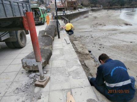 Estase recolocando o pavimento e as pedras que compoñen a defensa do paseo marítimo de Sta. Cruz. Ademais se esta a facer un mantemento do paseo desde a Praza do Castelo, ata o río, repoñendo as plaquetas de pizarra rotas polos temporais invernais.