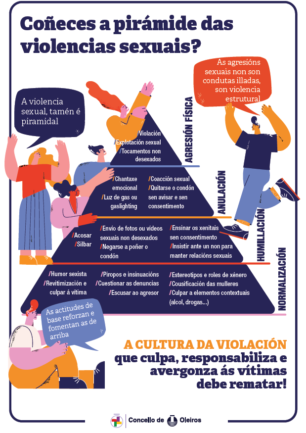 Podes descargar o cartaz "Coñeces a pirámide das violencias sexuais?" no desplegable "Documentos" que aparece a continuación.